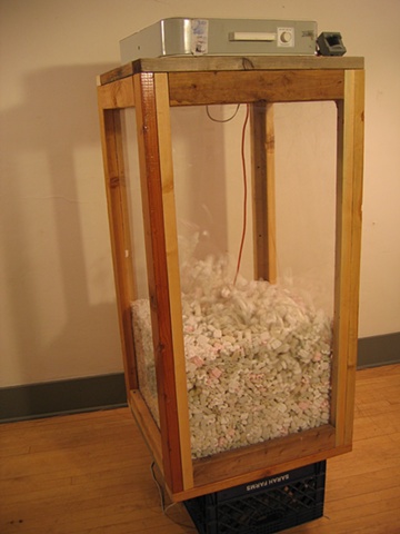 In this particular controlled environment a box fan on the bottom and on top force air upward which creates a rhythmic undulating movement, mixing all the material up. A motion sensor was placed on the unit, as someone stepped close it would activate the fans bringing the material to life.