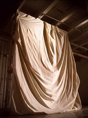 Constructed cloth walls that upon entering triggered several box fans which expanded the "walls" and trapped the viewer. It was set up properly, timed right and worked very well.